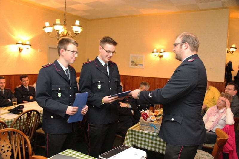 Nach der erfolgreichen Absolvierung des ersten Teils der Truppmannausbildung konnten Julian Kock und Philipp von Husen in die Einsatzabteilung übernommen und zum Feuerwehrmann befördert werden. Lars-Henrik Haase, Torben Haase, Thomas Gläser und Gero Diegner wurden für ein Jahr auf Probe aufgenommen. Ebenfalls in den nächsthöheren Dienstgrad befördert werden konnten Benjamin Krassmann und Frederik Cordes – vom Feuerwehrmann zum Oberfeuerwehrmann. Hauptfeuerwehrmann wurde Daniel Gürtler, Hauptfeuerwehrfrau Alica Kohlmann.