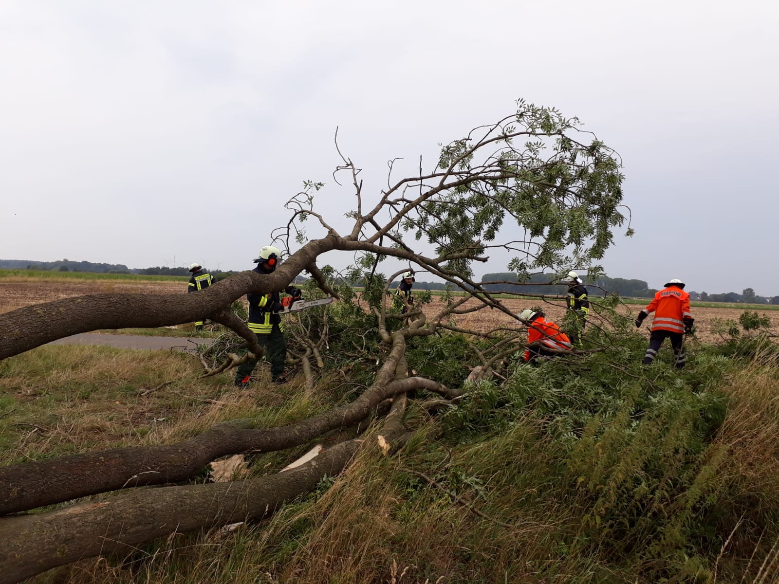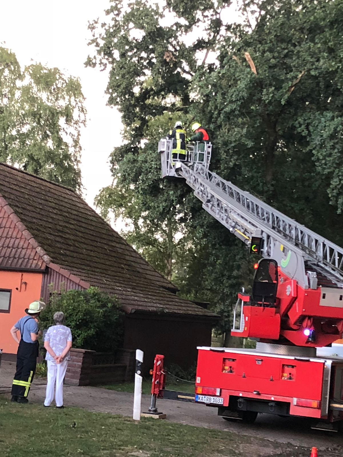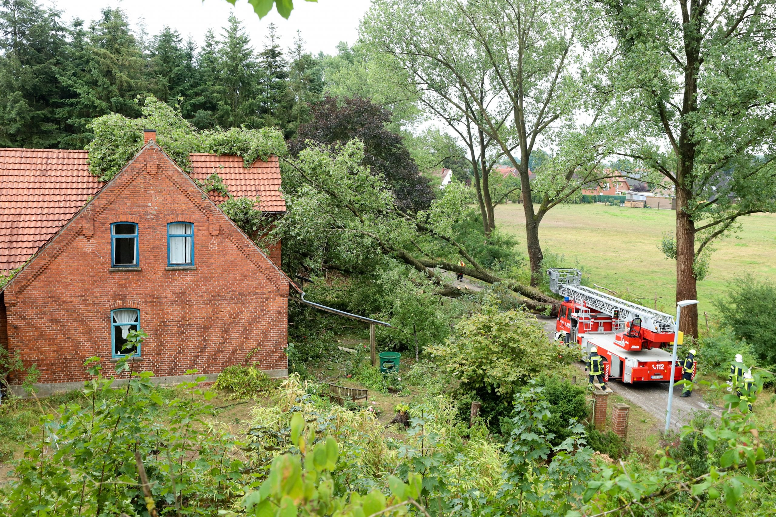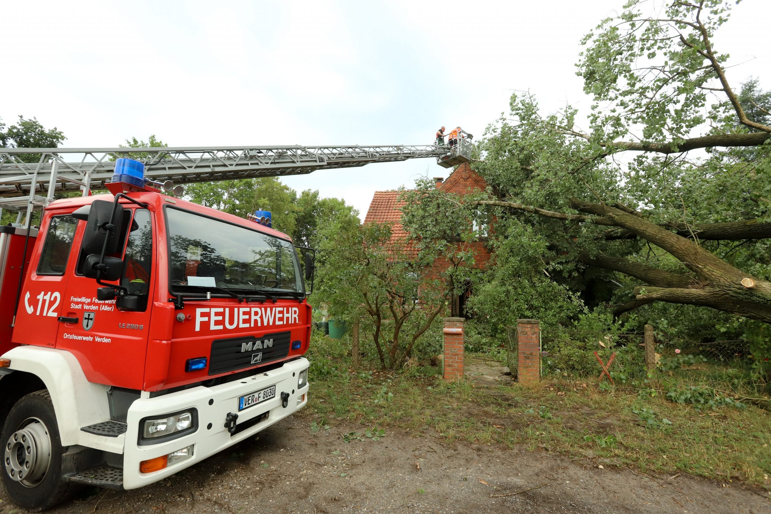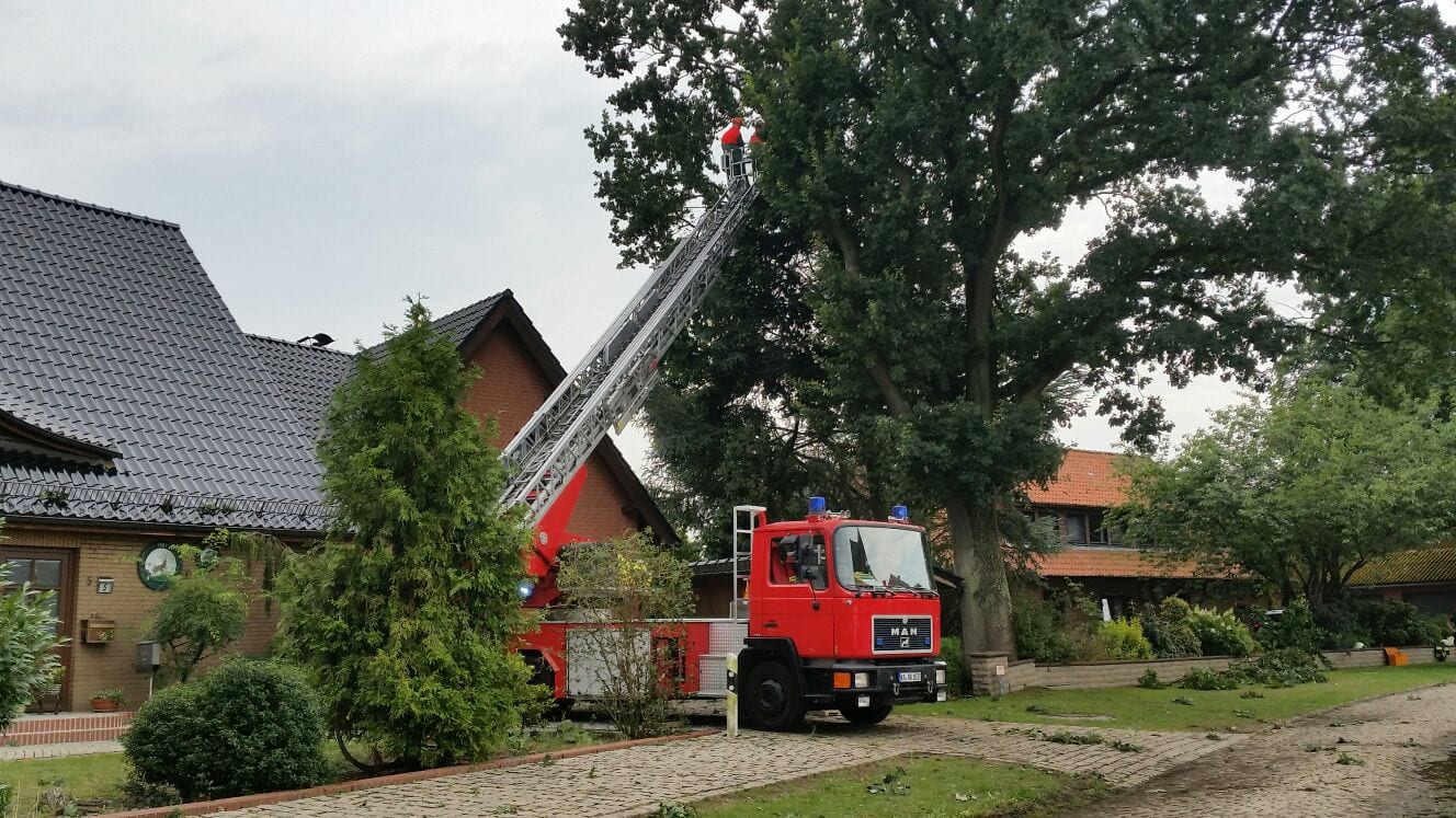 Am Samstagnachmittag zog eine kurze, aber heftige Unwetterfront über die Gemeinde Langwedel. Nach rund 15 Minuten Starkregen, gepaart mit heftigen Sturmböen, kamen sofort die ersten Einsatzmeldungen herein. In Daverden waren unter anderem ein großer Baum auf ein Wohnhaus gestürzt. Ein weiterer Baum hatte die Oberleitung der Bahnstrecke Bremen-Hannover beschädigt, die dadurch rund 2 Stunden gesperrt werden musste. In allen Ortschaften kamen weitere Einsätze hinzu. Umgestürzte Bäume, Bäume in Schräglage, die zu stürzen drohten, gebrochene Baumkronen, Äste die herabzufallen drohten. Unter der Leitung von Gemeindebrandmeister Ingo Lossau arbeiteten die Ortsfeuerwehren der Gemeinde bis in die Abendstunden die einzelnen Einsätze ab. Unterstützt wurden sie dabei von den Drehleitern aus Achim und Verden sowie dem THW Verden mit der Hubarbeitsbühne.
