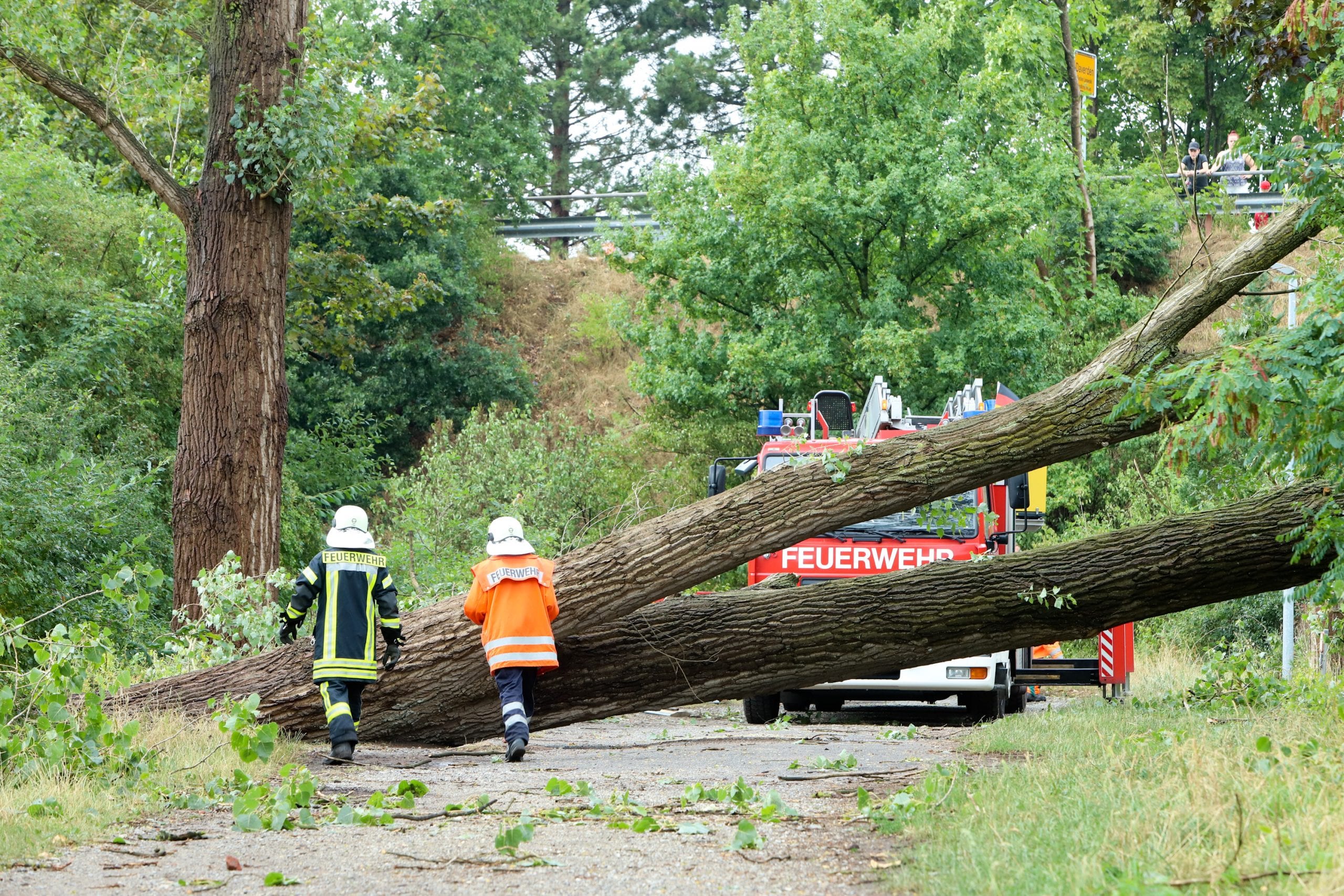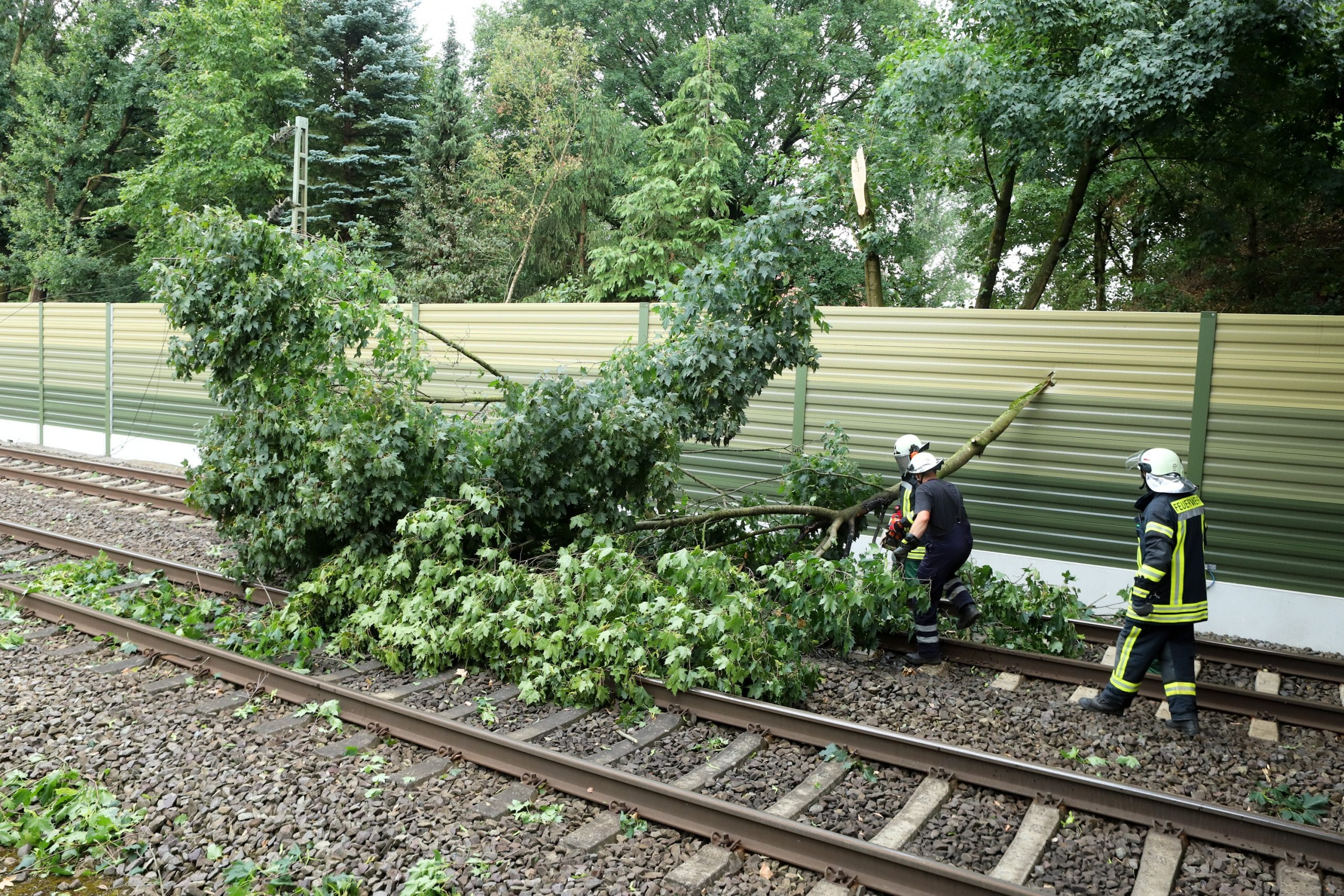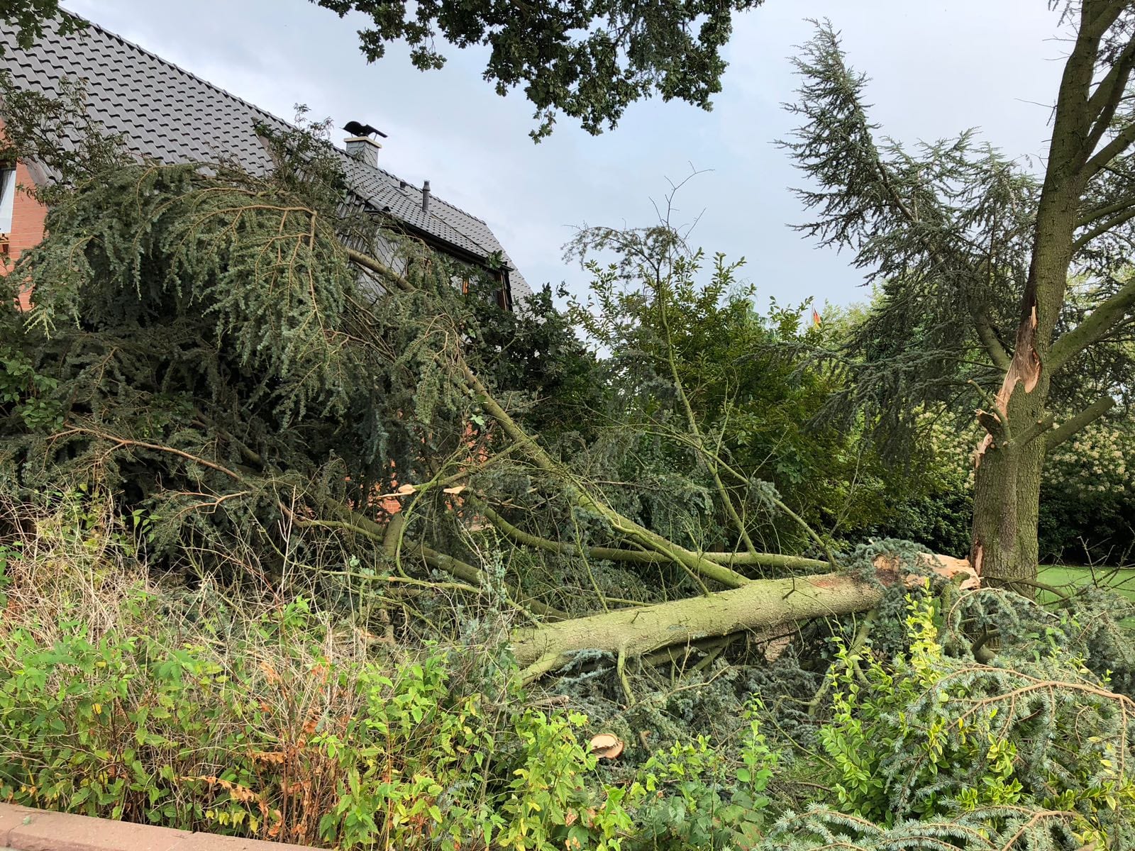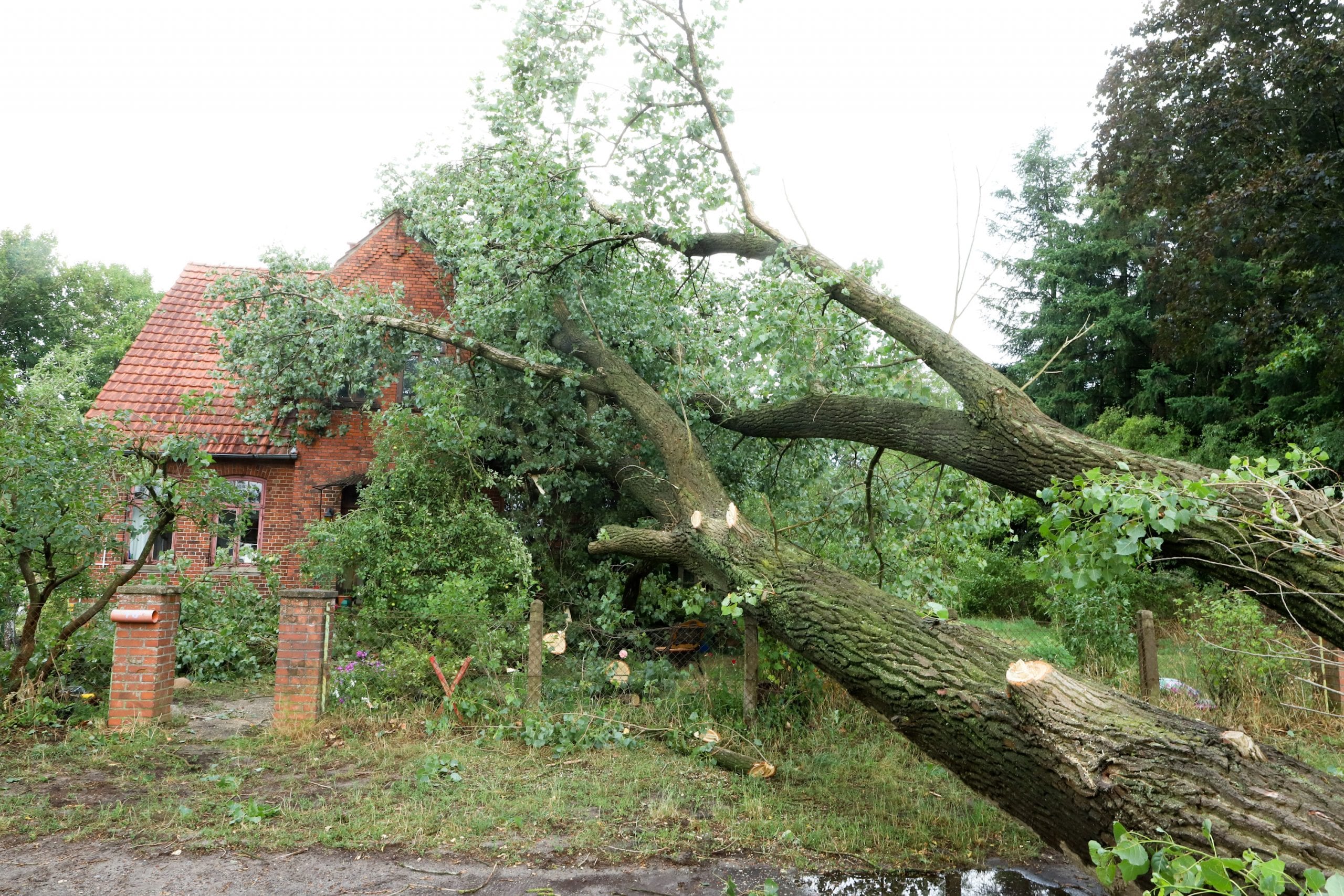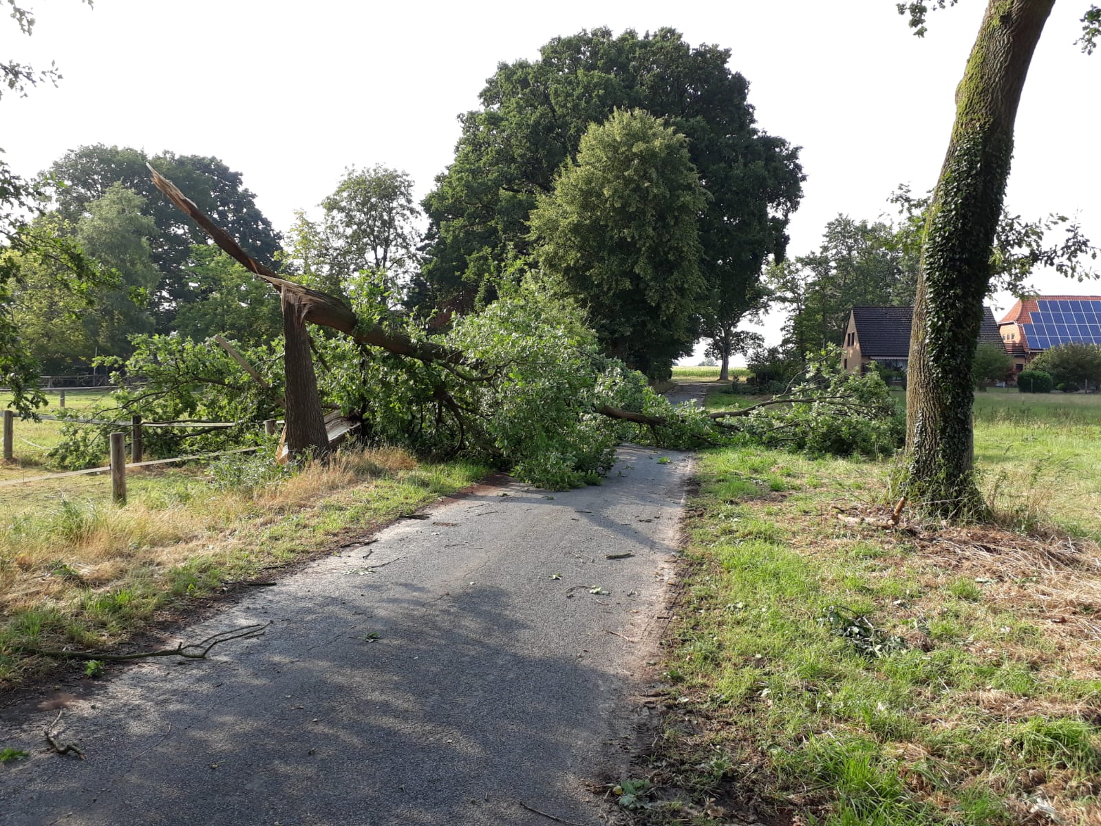 Am Samstagnachmittag zog eine kurze, aber heftige Unwetterfront über die Gemeinde Langwedel. Nach rund 15 Minuten Starkregen, gepaart mit heftigen Sturmböen, kamen sofort die ersten Einsatzmeldungen herein. In Daverden waren unter anderem ein großer Baum auf ein Wohnhaus gestürzt. Ein weiterer Baum hatte die Oberleitung der Bahnstrecke Bremen-Hannover beschädigt, die dadurch rund 2 Stunden gesperrt werden musste. In allen Ortschaften kamen weitere Einsätze hinzu. Umgestürzte Bäume, Bäume in Schräglage, die zu stürzen drohten, gebrochene Baumkronen, Äste die herabzufallen drohten. Unter der Leitung von Gemeindebrandmeister Ingo Lossau arbeiteten die Ortsfeuerwehren der Gemeinde bis in die Abendstunden die einzelnen Einsätze ab. Unterstützt wurden sie dabei von den Drehleitern aus Achim und Verden sowie dem THW Verden mit der Hubarbeitsbühne.