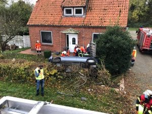 Bei einem Verkehrsunfall auf der Ottersberger Straße (L155) wurde am Montagvormittag kurz nach 11 Uhr eine 81-jährige Renault-Fahrerin schwer verletzt. Die Frau war mit ihrem Pkw aus Posthausen kommend in Richtung Völkersen unterwegs, als sie alleinbeteiligt und aus ungeklärter Ursache nahe des Ortseingangs Völkersen nach rechts von der Fahrbahn abkam. Der Wagen prallte gegen eine gemauerte Gartenbegrenzung und überschlug sich in der Folge. Auf der Beifahrerseite liegen kam der Wagen letztlich im Vorgarten zum Liegen. Die Feuerwehren aus Völkersen, Langwedel und Etelsen wurden alarmiert. Die Einsatzkräfte stabiliersten das Auto zunächst und konnten die Frau dann recht schnell durch die Windschutzscheibe aus dem PKW befreien. Anschließend wurde sie mit einem Rettungswagen in eine Klinik gefahren. Nach rund einer Stunden war der Einsatz für die Feuerwehr beendet.