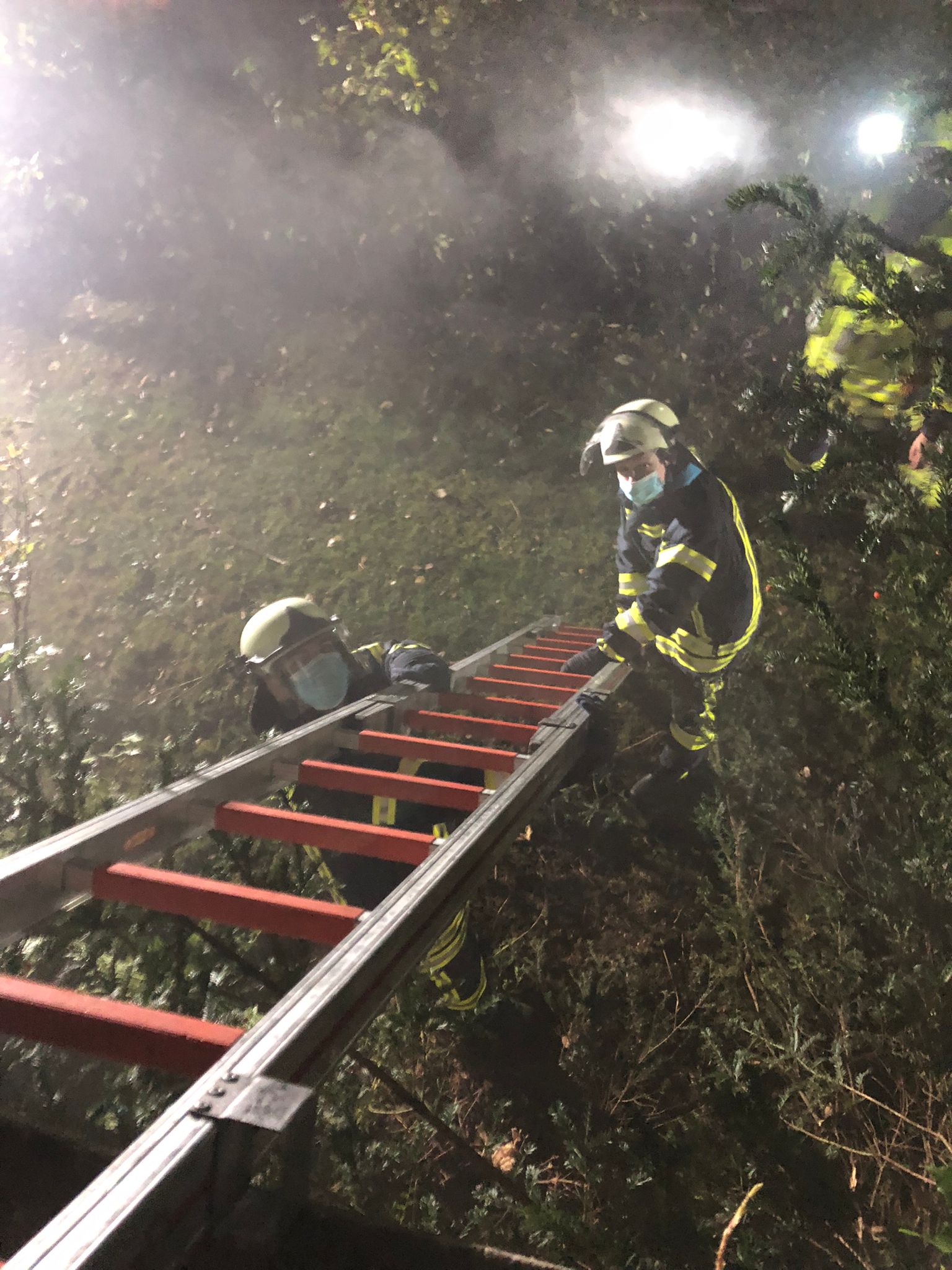 Drei Trupps wurden während der Übung unter PA (Pressluftatmer) eingesetzt. Der erste Trupp ging zur Menschenrettung in das voll verrauchte Gebäude vor, während der zweite Trupp die Brandbekämpfung durchführte. Währenddessen wurden vor dem Gebäude durch die weiteren Kameraden Beleuchtungseinrichtungen aufgebaut, sowie eine Anleiterbereitschaft hergestellt. Diese ist enorm wichtig als zweiter Rettungsweg, da der dritte Angriffstrupp bis in das OG des Hauses vordrang. Zur Herstellung der Anleiterbereitschaft musste ein vor dem Gebäude stehender Busch mittels Kettensäge beseitigt werden.
