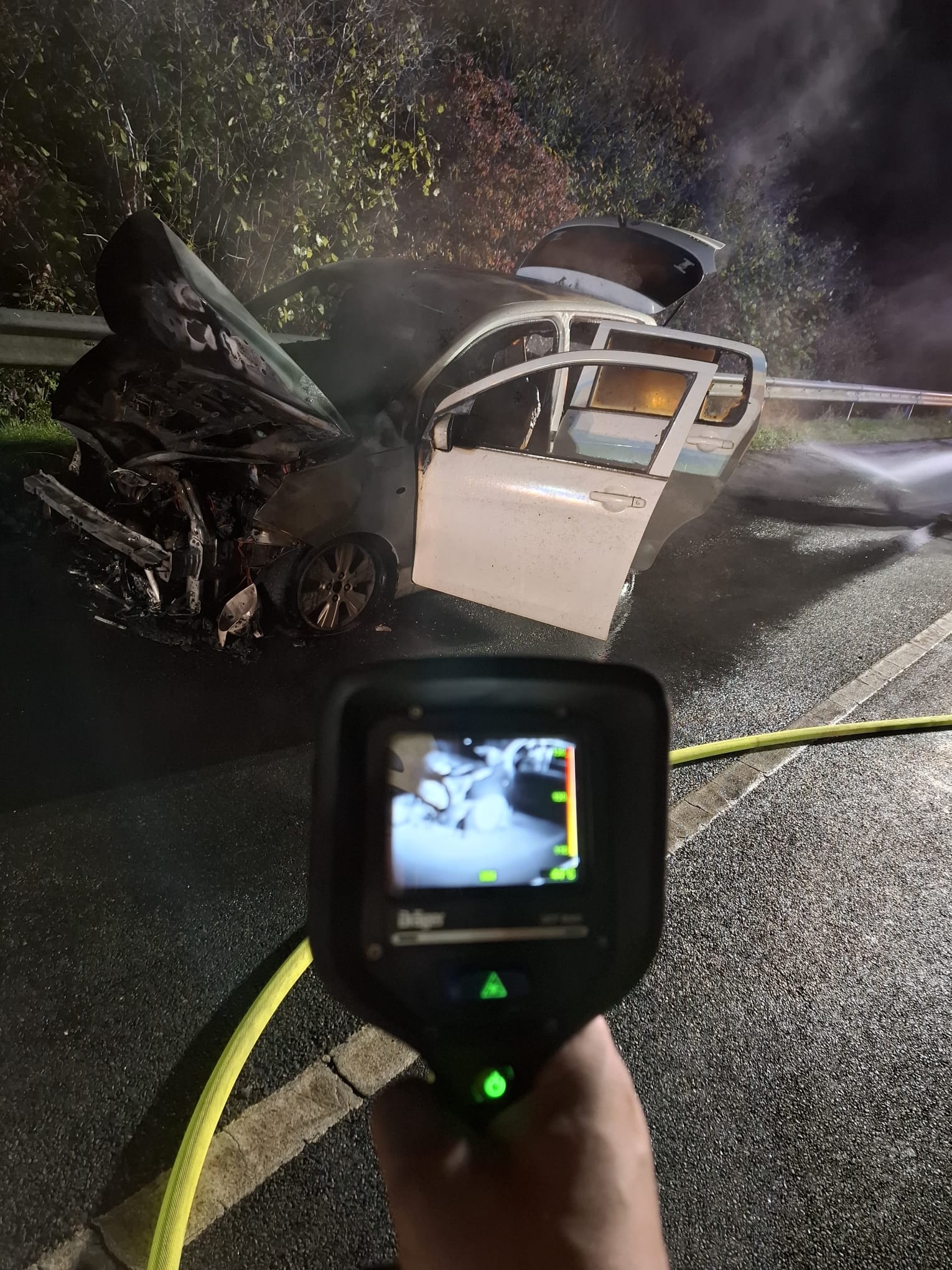 Beim Eintreffen der Einsatzkräfte stand das Fahrzeug im vorderen Bereich in Vollbrand. Der Brand hatte bereits auf den Innenraum übergegriffen.