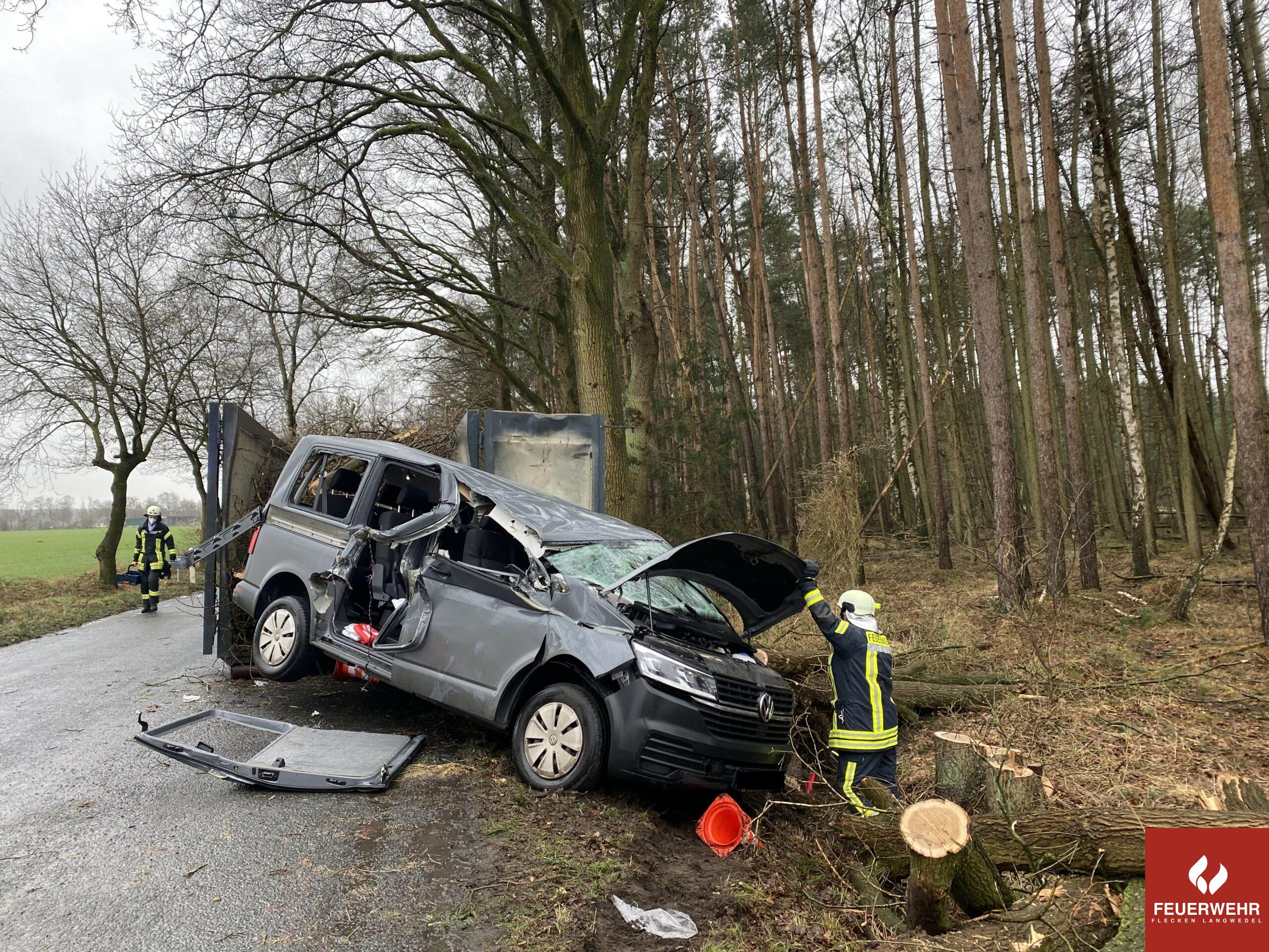 Ein schwerer Verkehrsunfall sorgte am Montagnachmittag für einen Großeinsatz von Feuerwehr und Rettungsdienst in Haberloh. Nach ersten Angaben war ein mit fünf Personen besetzter VW-Bus auf der Haberloher Dorfstraße in Richtung Völkersen mit einem Bagger kollidiert, der am Straßenrand Baumfällarbeiten durchführte. Der VW-Bus erwischte den Bagger mit der Beifahrerseite, schleudete herum und prallte rund 50 Meter weiter rückwärts gegen eine abgestellte Mulde. Durch den Aufprall wurden zwei der fünf Insassen schwer verletzt, die anderen drei Personen leicht verletzt. Die Meldung von eingeklemmten Personen bestätigte sich bei Eintreffen glücklicherweise nicht. Alle fünf Insassen waren schon aus dem Unfallwrack befreit und wurden vor Ort von Ersthelfern betreut. Notfallsanitäter der Feuerwehr halfen nach Eintreffen bei der Betreuung der Verletzten. Der Rettungsdienst rückte mit zwei Notärzten und fünf Rettungswagen an. Alle Fahrzeuginsassen kamen in umliegende Krankenhäuser. Die Feuerwehr sicherte die Unfallstelle und musste nach Abtransport der Verletzten noch zwei Bäume am Straßenrand fällen, die von dem Unternehmen vor Ort bereits angesägt worden waren. Nach rund 90 Minuten konnte der Einsatz aller Kräfte beendet werden. Neben den Ortsfeuerwehren Völkersen, Holtebüttel, Langwedel und Etelsen war auch die Ortsfeuerwehr Verden mit ihrem Rüstzug im Einsatz, der bei größeren Unfällen mit in die Gemeinde Langwedel ausrückt.
